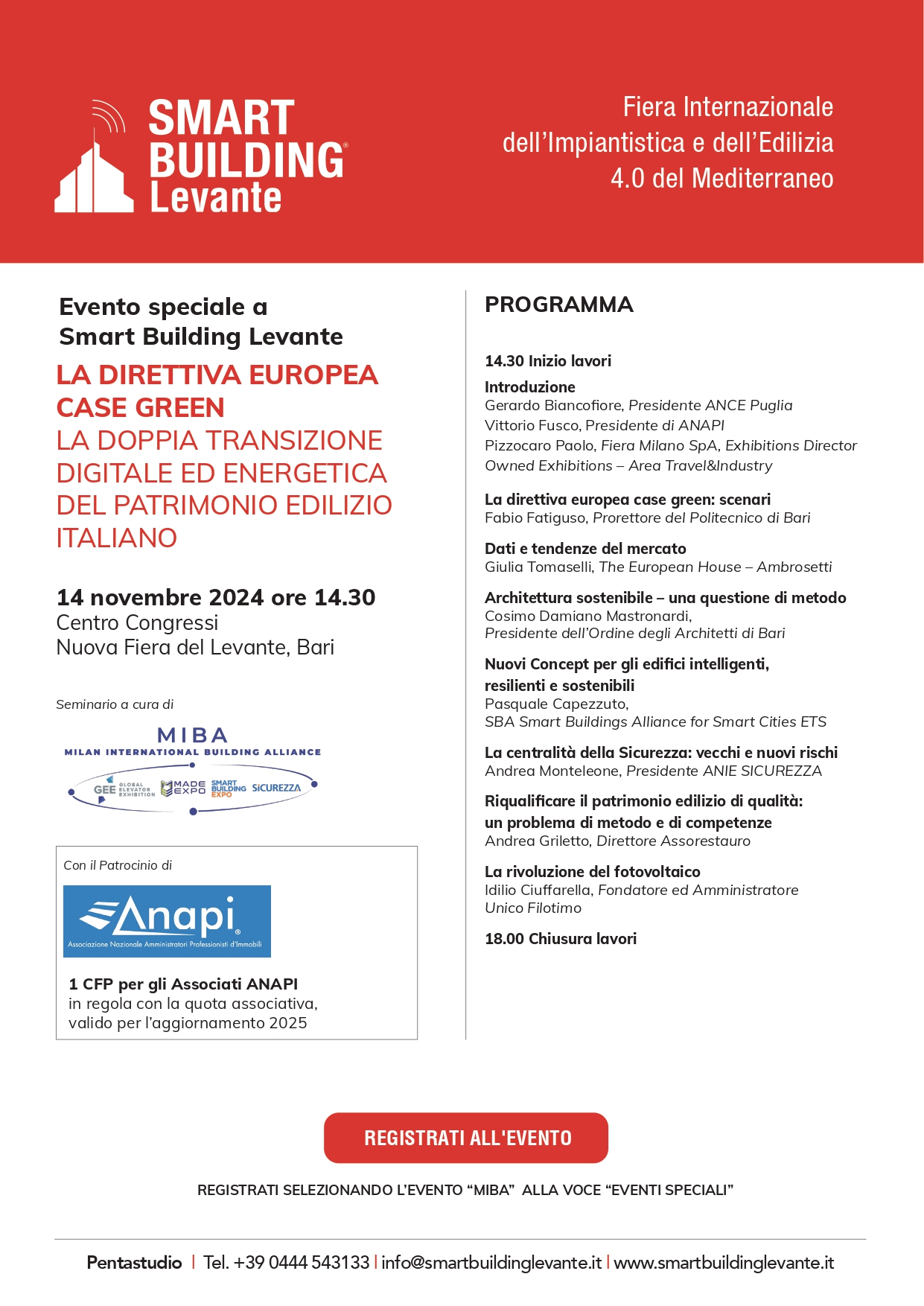 In occasione dell’edizione 2024 dello Smart Building che si svolgerà a Bari presso la Fiera del Levante, il Presidente Nazionale ANAPI, Dott. Vittorio Fusco, terrà un intervento introduttivo il 14 novembre per l’evento “La Direttiva Case Green”.